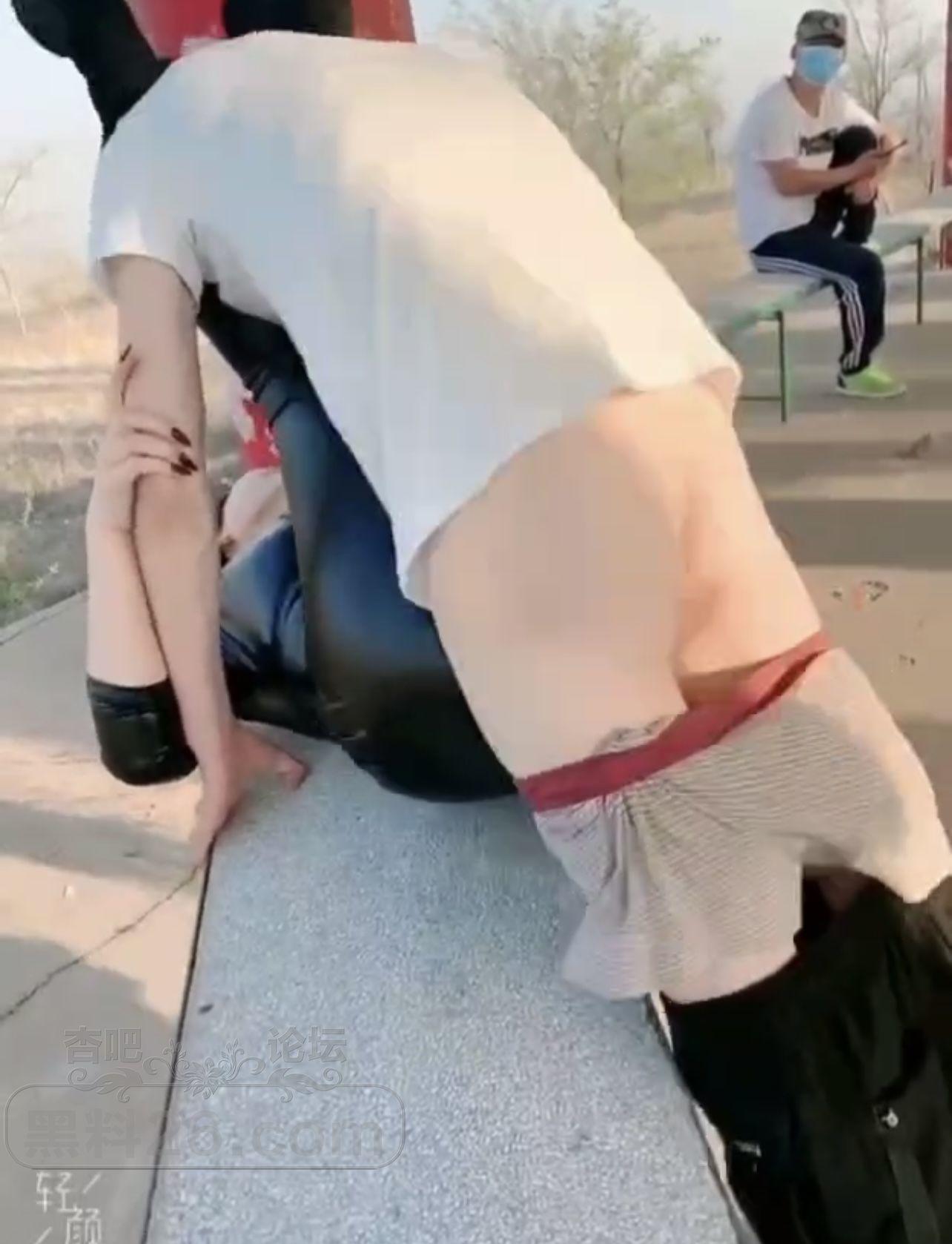 东北户外野战大长腿皮裤御姐,公园凉亭里直接多人运动,玩的真是666啊