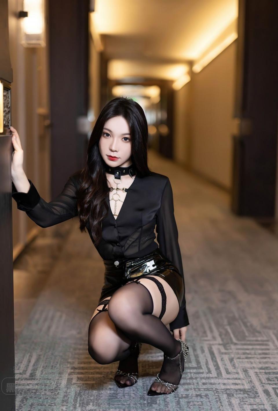 黑色皮短裙性感女郎高级酒店低胸衫黑丝长腿销魂【20P】